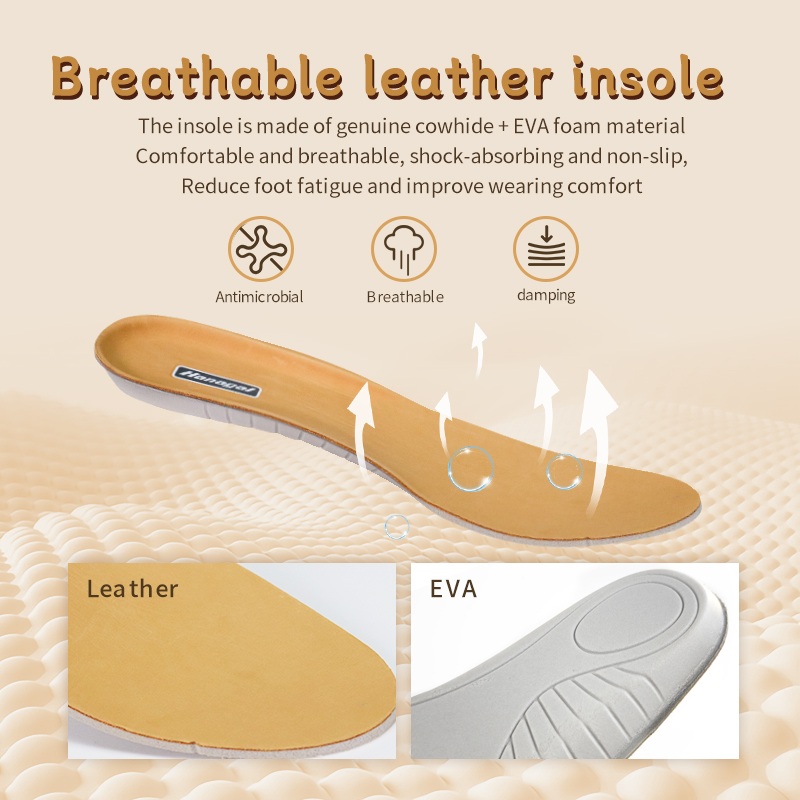 Äkta kohud + EVA-skum innersula - andas, stötdämpande och halkfri. Håller fötterna fräscha mil efter mil.
