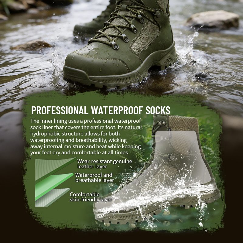 Innerfodret använder en professionell vattentät strumpa som täcker hela foten. Dess naturliga hydrofoba struktur håller vatten ute samtidigt som värme och svett släpps ut – så att dina fötter förblir torra och bekväma.
